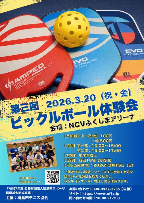 3月20日(金・祝)にNCVふくしまアリーナにてピックルボール体験会があります。